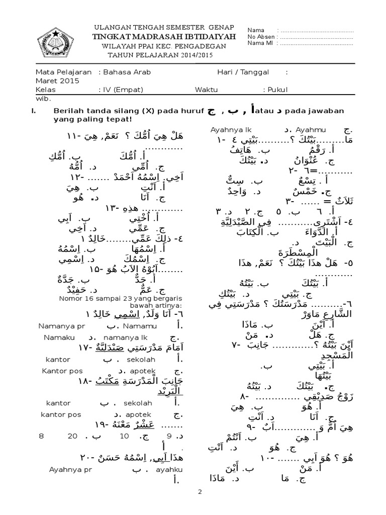 Soal bahasa arab kelas 4 pilihan ganda yang mudah dan jawaban / soal jawaban pat bahasa arab kelas 1 mi semester 2 tahun 2021 info pendidikan terbaru. Latihan soal pat bahasa arab kelas 2 mi 2021/2022 dan kunci jawaban pdf, download. Soal pat kelas 4 b. 3.7 memahami fungsi sosial dan unsur kebahasaan (bunyi, kata dan makna) dari teks sangat sederhana terkait tema : Soal ukk/ uas kelas 4 b.